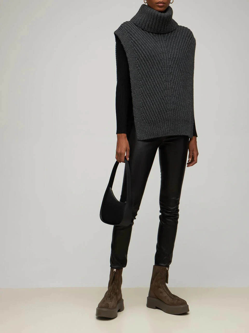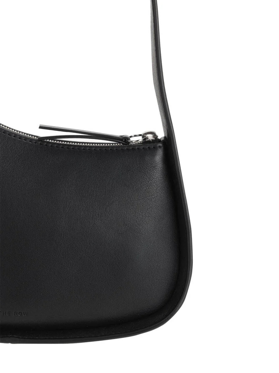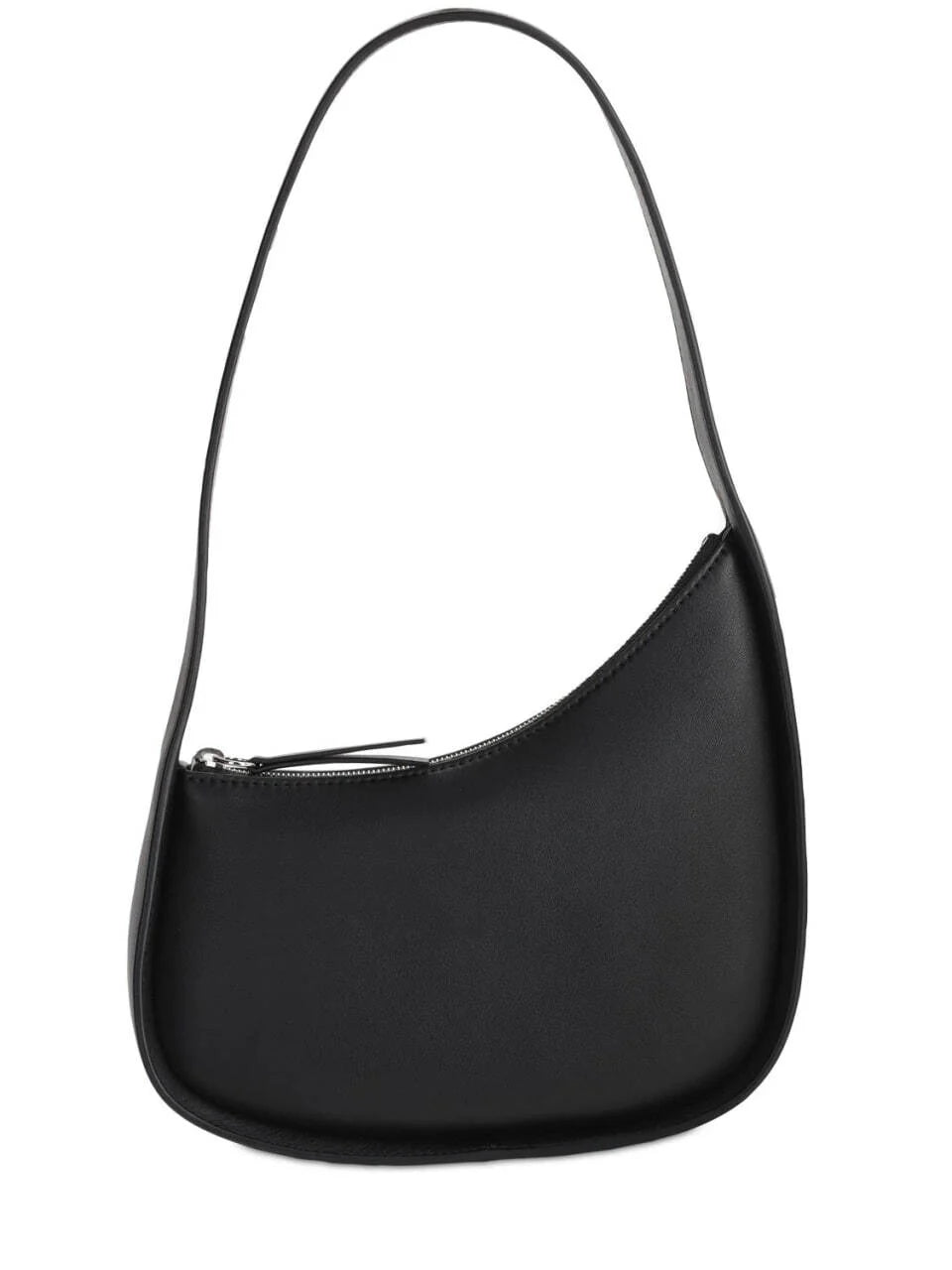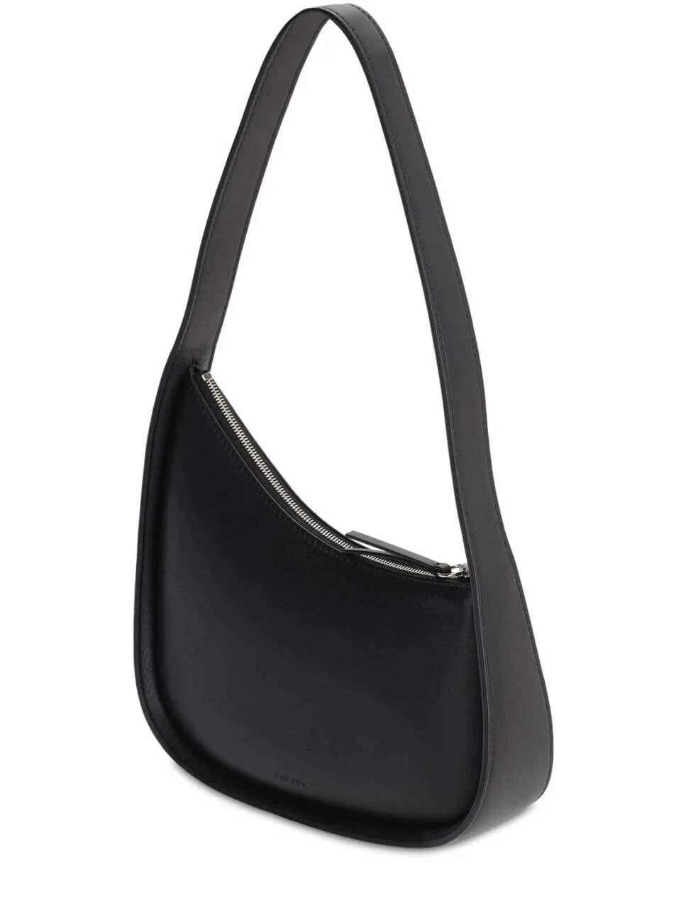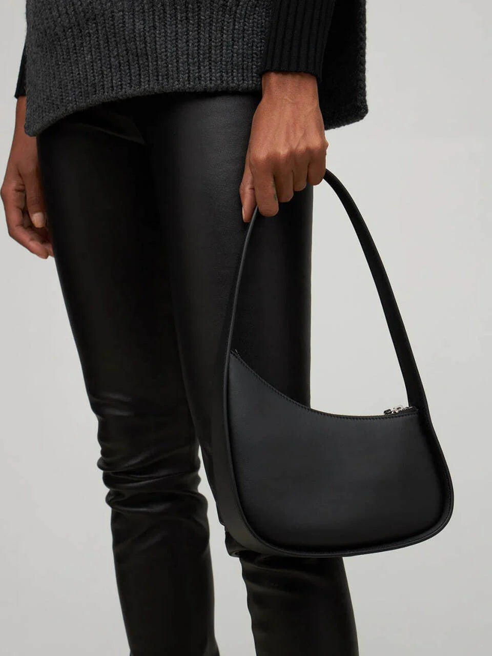 Ергономічна напівжорстка сумка з гладкої натуральної шкіри має плоский плечовий ремінь і вигнуту застібку-блискавку, поєднуючи функціональність із витонченим стилем.