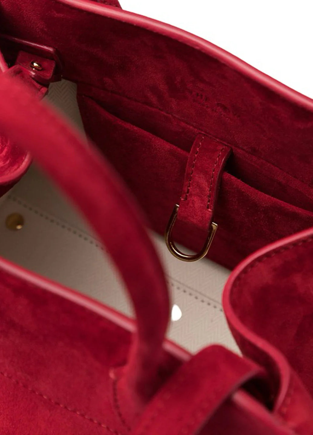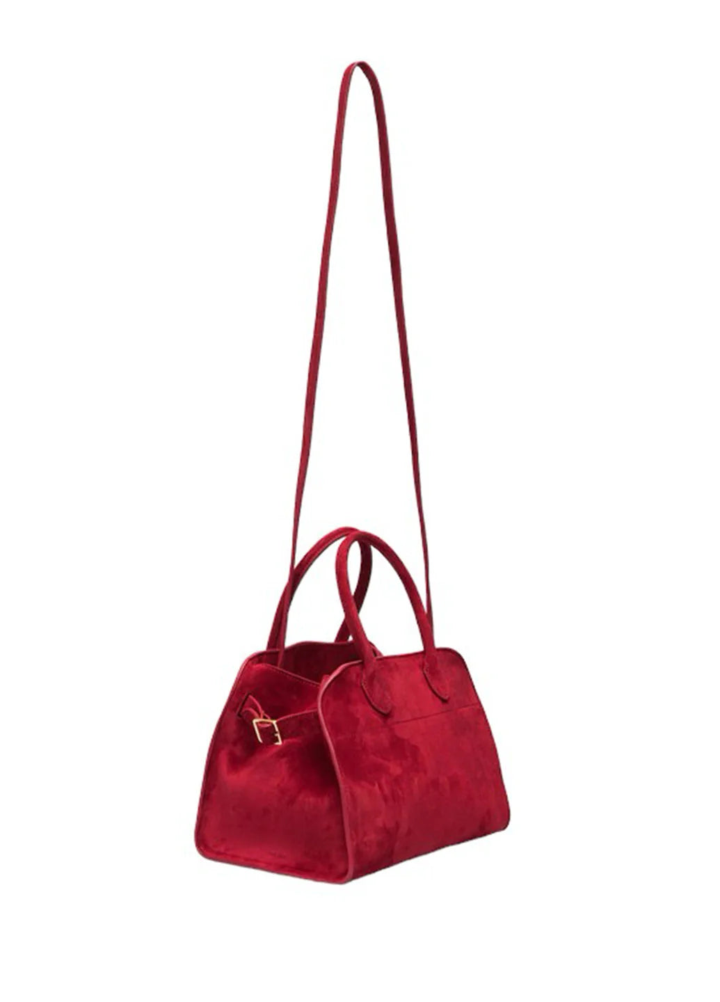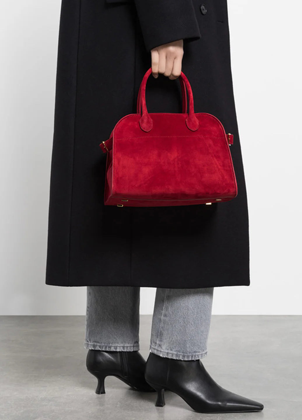 Сумка Margaux 10 від The Row відображає мінімалістичну естетику бренду. Виготовлена в Італії з м’якої замші з шкіряними акцентами, вона має просторий внутрішній відсік та тонку кишеню для карток або ключів. Сумку можна носити за верхні ручки або використовувати знімний ремінь для носіння через плече.