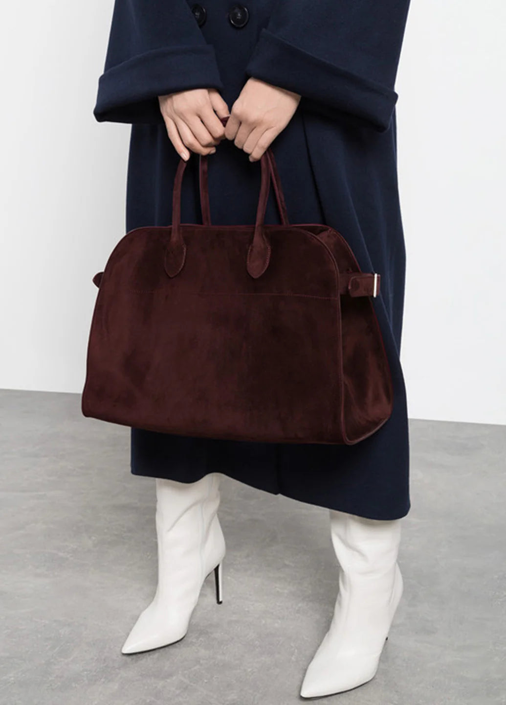 Сумка Margaux 15 від The Row відображає мінімалістичну естетику бренду. Виготовлена в Італії з м’якої замші з шкіряними акцентами, вона має просторий внутрішній відсік та тонку кишеню для карток або ключів. Сумку можна носити за верхні ручки або використовувати знімний ремінь для носіння через плече.