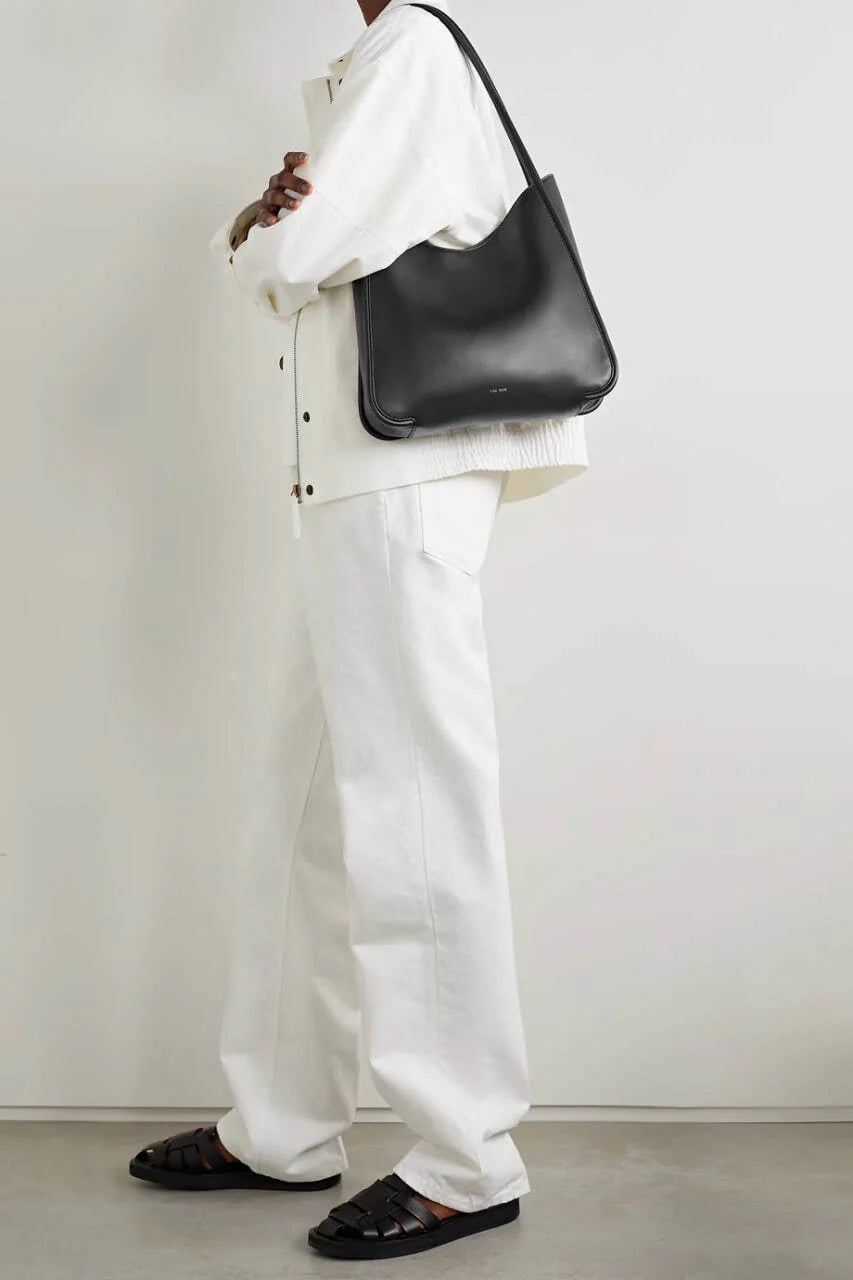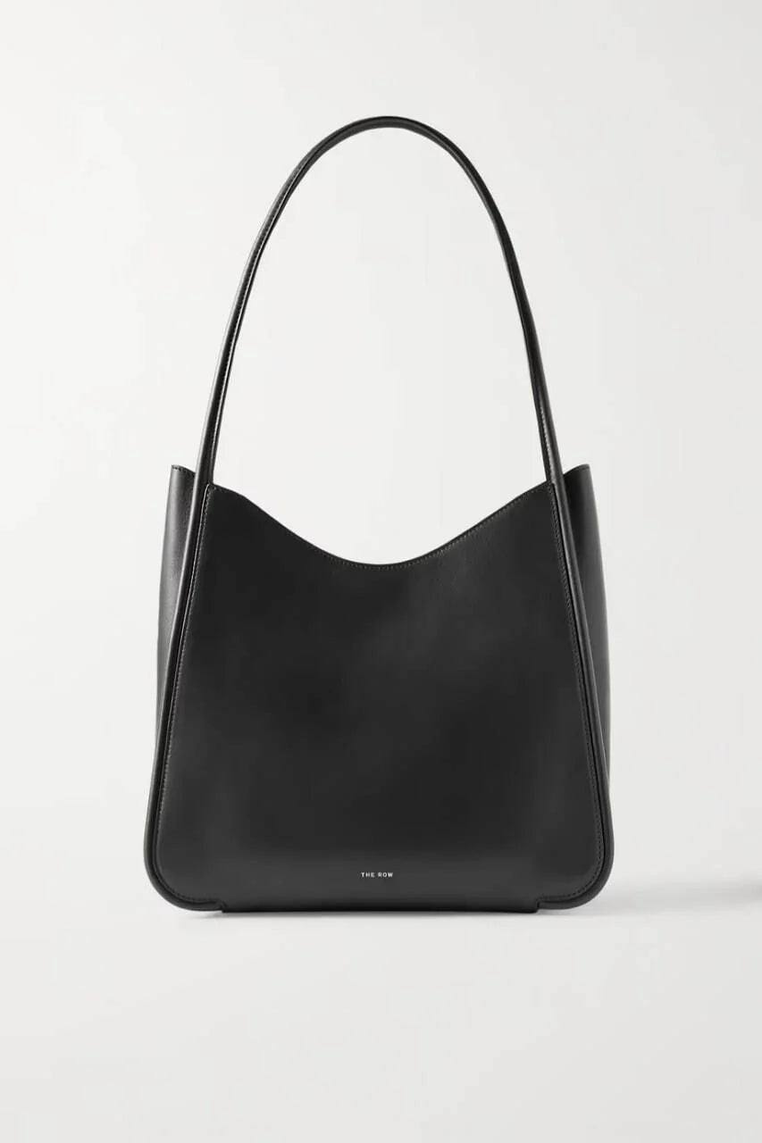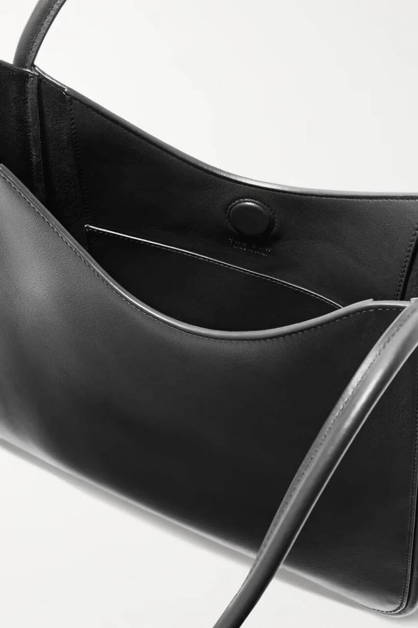 Сумки The Row відомі своєю здатністю залишатися актуальними протягом багатьох років завдяки мінімалістичному дизайну та преміальним матеріалам. Модель "Symmetric" виготовлена з гладкої чорної шкіри, прикрашеної сріблястим логотипом бренду. Її елегантний силует надає достатньо простору для повсякденних речей.