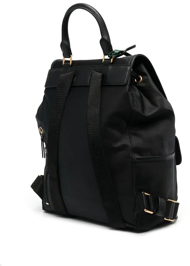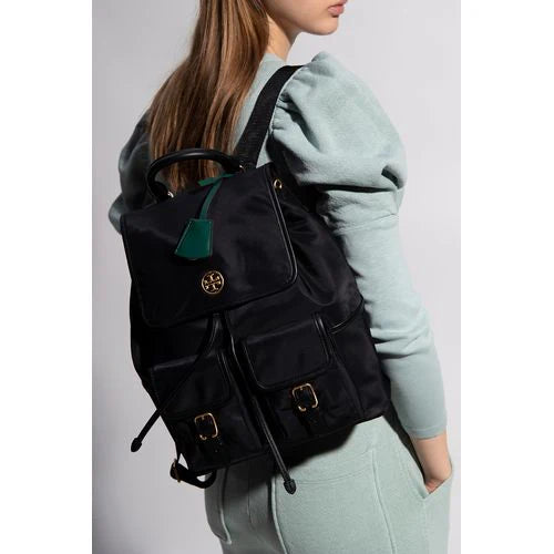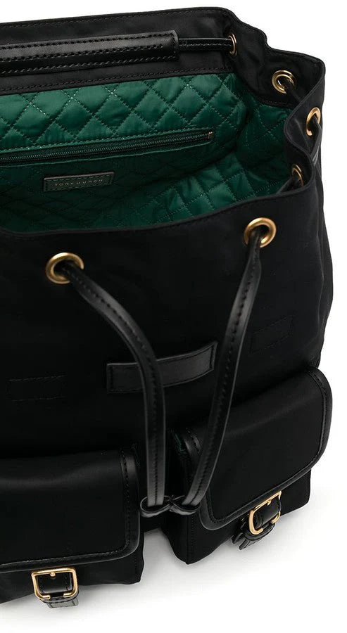 Рюкзак від Tory Burch звучить як стильний і функціональний аксесуар для повсякденного використання. Використання переробленого нейлону підкреслює його екологічну обізнаність, а шкіряне оздоблення та декор Double T додають елегантності та розкоші. Відкидний клапан та зав'язка на шнурку забезпечують зручний доступ до основного відділення, а різноманітні кишені дозволяють організувати речі.
