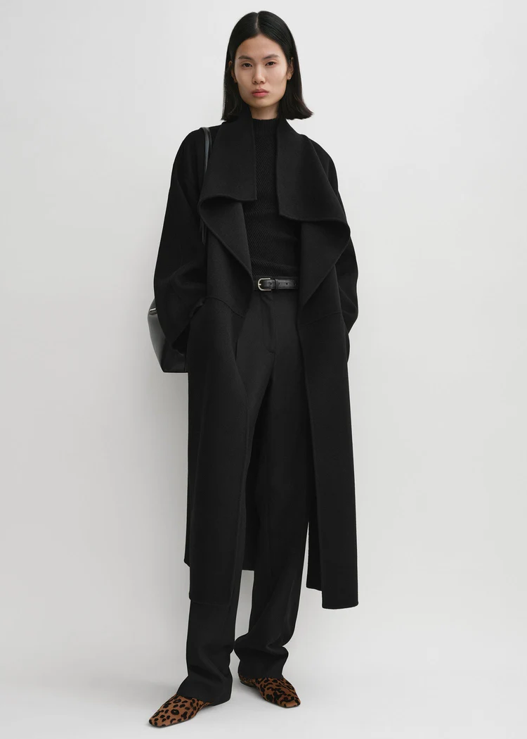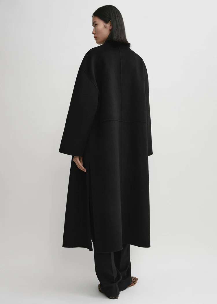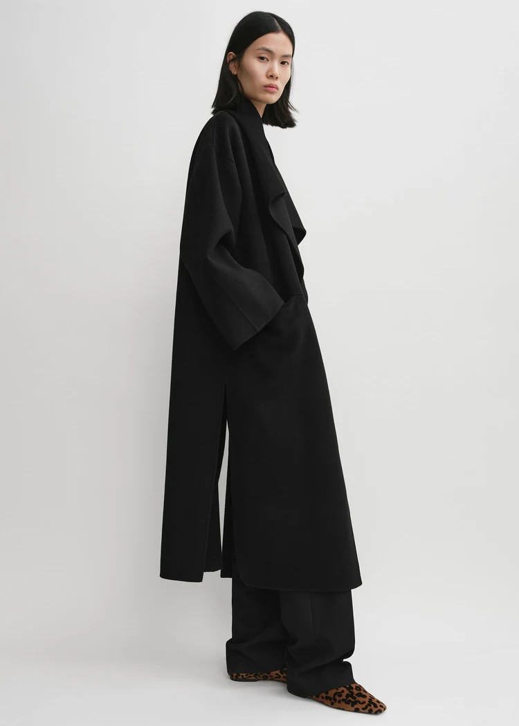 Фірмове пальто виготовлене з м'якої подвійної тканини TOTEME - суміші вовни та кашеміру з відповідального виробництва, яка створюється шляхом ручного зшивання двох тонких шарів для отримання двосторонньої обробки з чистими швами. Силует оверсайз з легкими в стилізації шалевими лацканами, спущеними плечима і відкритим передом, що робить його ідеальним для багатошарового використання, доповнений вшитими кишенями і боковими розрізами.