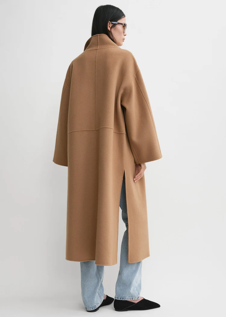 Фірмове пальто виготовлене з м'якої подвійної тканини TOTEME - суміші вовни та кашеміру з відповідального виробництва, яка створюється шляхом ручного зшивання двох тонких шарів для отримання двосторонньої обробки з чистими швами. Силует оверсайз з легкими в стилізації шалевими лацканами, спущеними плечима і відкритим передом, що робить його ідеальним для багатошарового використання, доповнений вшитими кишенями і боковими розрізами.