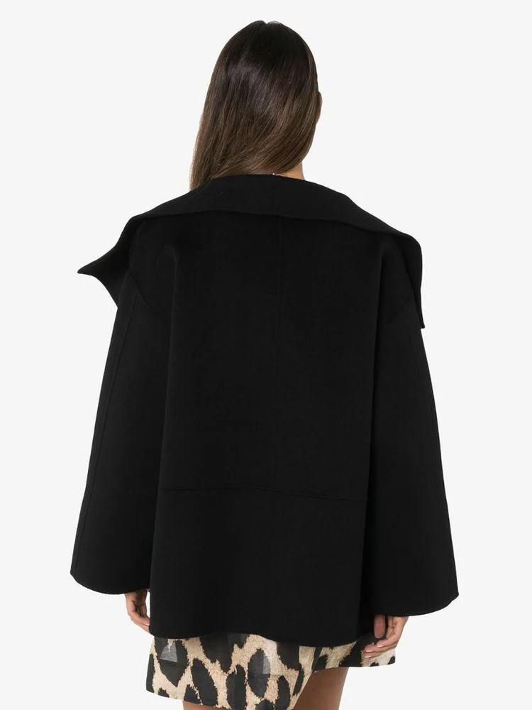 Коротке фірмове пальто виготовлене з м'якої подвійної тканини TOTEME - суміші вовни та кашеміру з відповідального виробництва, яка створюється шляхом ручного зшивання двох тонких шарів для отримання двосторонньої обробки з чистими швами. Силует оверсайз з легкими в стилізації шалевими лацканами, спущеними плечима і відкритим передом, що робить його ідеальним для багатошарового використання, доповнений вшитими кишенями і боковими розрізами.