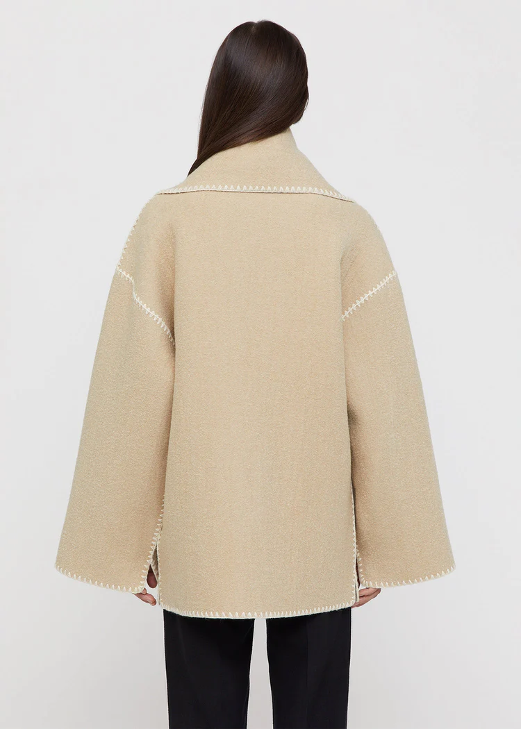 Куртка-пальто від TOTEME виготовлена з важкого і структурованого фетру з вовняної суміші, яка сертифікована за стандартом Responsible Wool Standard, що гарантує екологічність та високу якість вовни. Куртка має об'ємний крій зі спущеними плечима, що створює модний і розкішний образ. Широкі рукави з розрізами і накладні кишені додають додаткового комфорту і стилю. Шарф з вишивкою по краях надає цій куртці елегантного завершення і робить її неповторною. Ця куртка-пальто стане відмінним вибором для холодних днів, додаючи вашому образу розкіш і стиль.