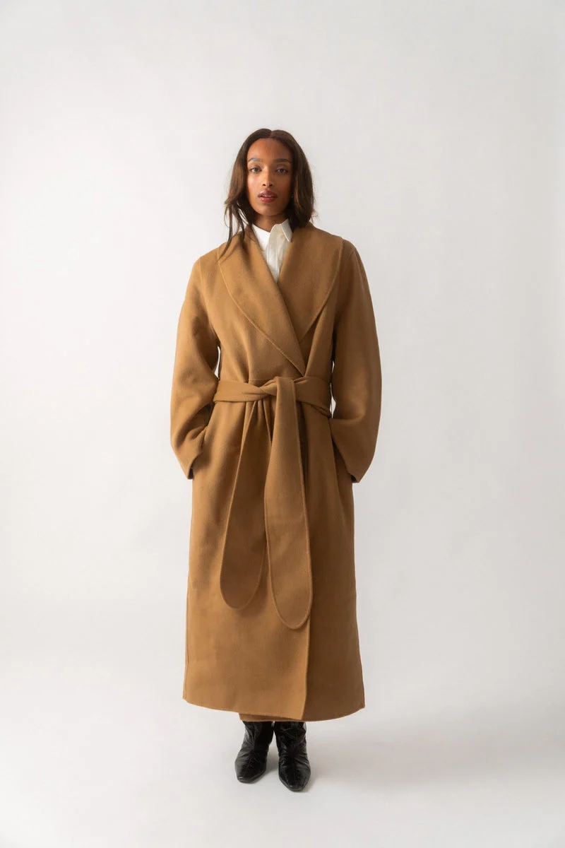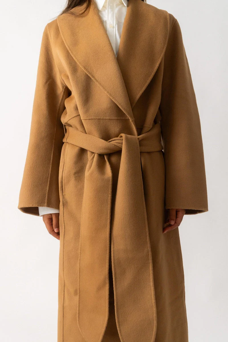 Пальто Robe Coat є винятковою демонстрацією фірмового стилю Toteme. Цей виріб, що являє собою рифму класичного вовняного пальта повної довжини, виготовлений з блискучої подвійної вовняної тканини, що надає йому розкоші та вишуканості. Широкі шалеві лацкани додають витонченості, а пояс на талії надає силуету жіночності і грації. Прорізні кишені на стегнах додають практичності та стилю.