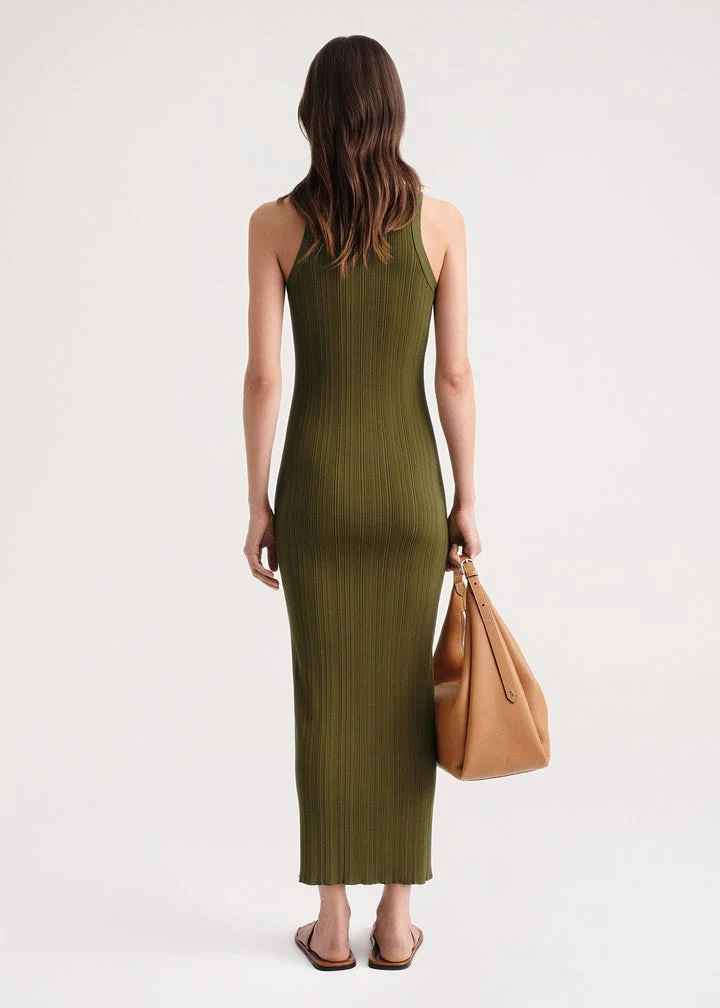 Ребриста сукня TOTEME, виготовлена з віскозної та переробленої поліамідної пряжі, має безшовний стрункий силует. Сукня має круглий виріз горловини і вигнуті пройми, що акцентують увагу на плечах, а потім спадає до щиколотки. Влітку поєднуйте її з босоніжками та кросівками.