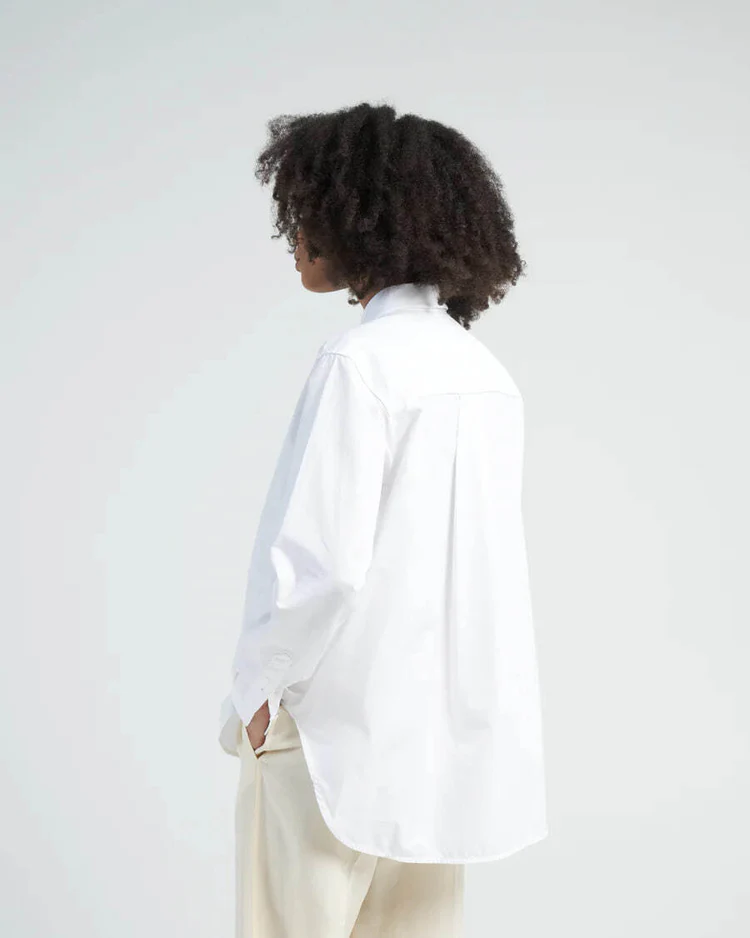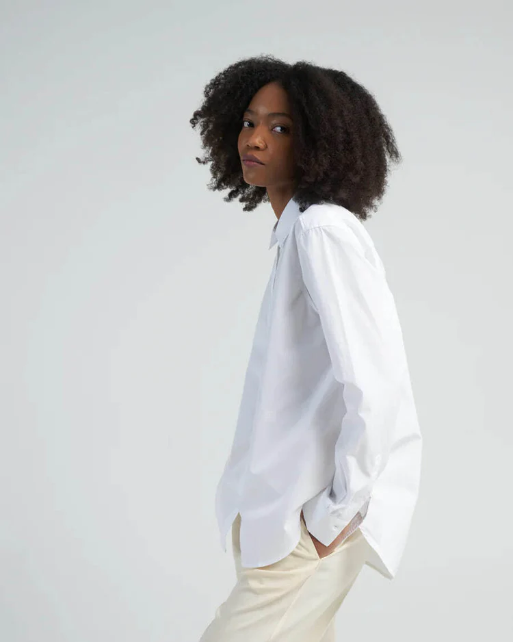 Ця сорочка від TOTEME має характерний подовжений поділ ззаду, який створює ефектний A-силует. Вона виготовлена з хрусткого попліну з органічної бавовни і має злегка приталений силует з відкладним коміром. Декорована перламутровими ґудзиками спереду та на манжетах, а також має вишиту фірмову монограму. Ця сорочка є необхідним базовим елементом гардеробу, який ніколи не виходить з моди.