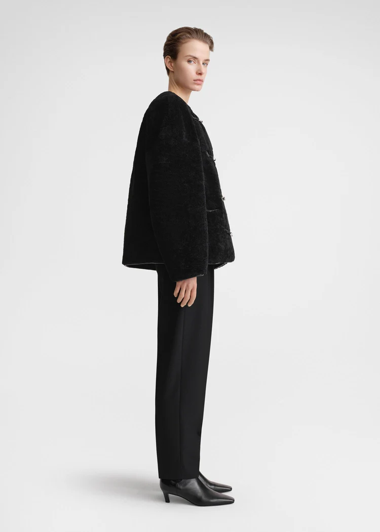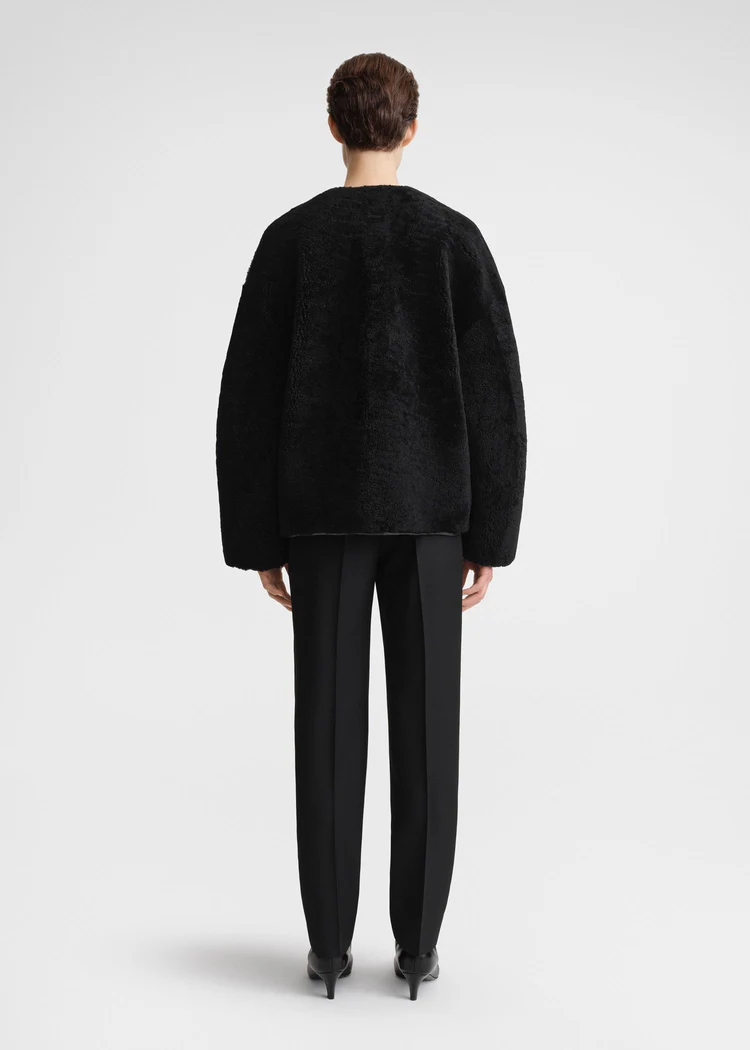Зимова куртка від TOTEME вражає своїм комфортом та стилем. Виготовлена з м'якої та теплої овчини з еластичною шкіряною підкладкою та контрастними вставками, вона є ідеальним вибором для холодних днів. Приспущені плечі та широкі рукава створюють розслаблений, об'ємний силует, застібається вона на металеві застібки сріблястого кольору. Ця куртка не лише зігріє вас в холодну погоду, але й стане виразом вашого вишуканого смаку та стилю.
