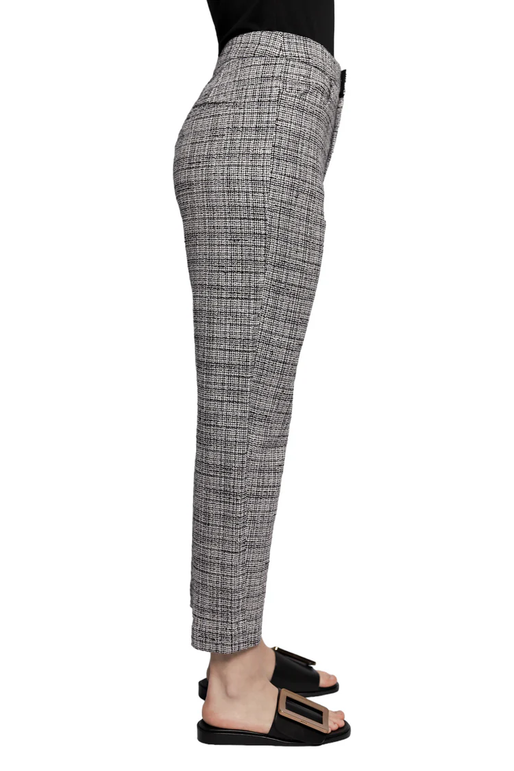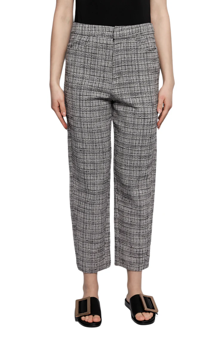 Ці брюки Toteme Tweed вражають своїм класичним стилем і вишуканістю. Вони виготовлені з високоякісного твіду, що надає їм текстурну глибину і елегантність. Чорно-білий візерунок додає вишуканості цьому виробу. Застібка на блискавці та гачках забезпечує зручність і фіксацію. Дві бічні кишені та дві задні кишені додають практичності. Брюки мають прямий крій і середньої висоти талію, що створює ідеальну симетрію та підкреслює вашу фігуру.