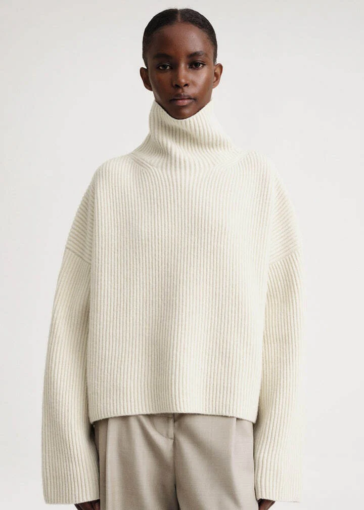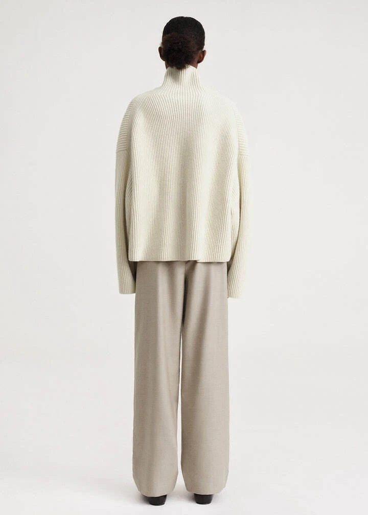 Цей светр від TOTEME виготовлений з грубої ребристої вовни, яка сертифікована за стандартом Responsible Wool Standard, що свідчить про його відповідність високим екологічним та етичним стандартам. Він призначений для вільної посадки і має широкий силует з високою горловиною, приспущеними плечима, довгими рукавами і прямим подолом. Цей светр поєднує в собі комфорт, якість та стиль, ідеальний вибір для створення модного та затишного образу.