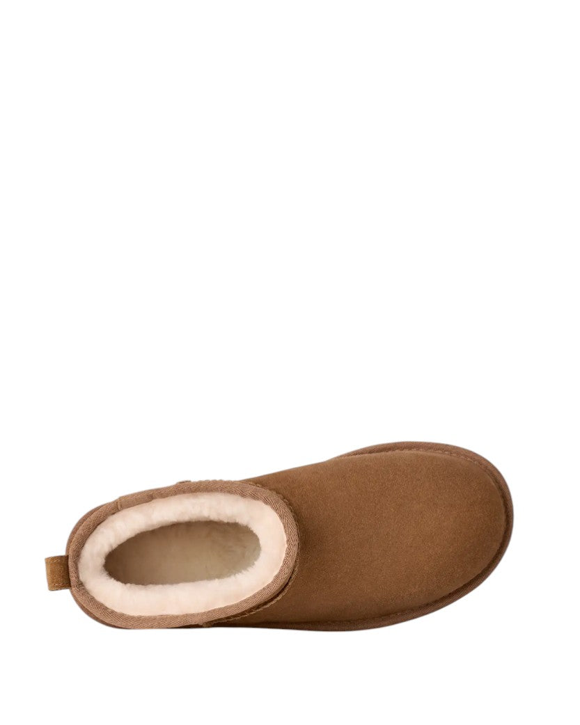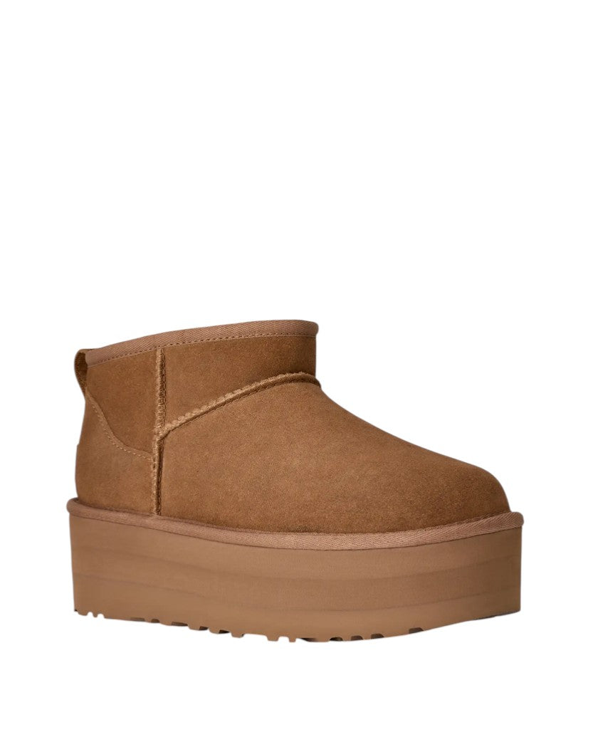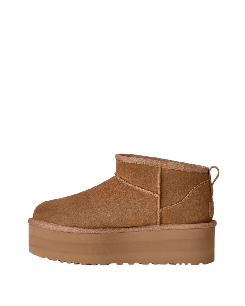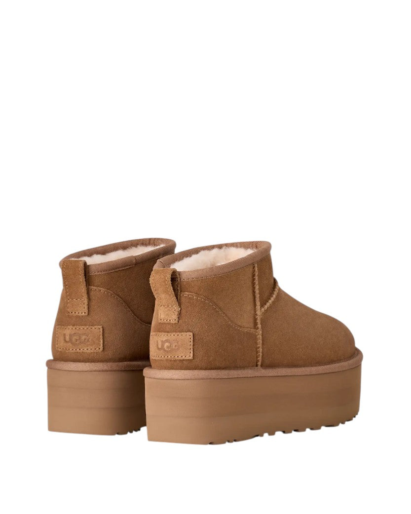 Коричневі черевики 'Classic Ultra Mini Platform' від UGG. Ця модель, виготовлена з натуральної шкіри Twinface, має нашивку з логотипом на заднику, текстильну палітурку зі 100% перероблених поліефірних волокон, устілку UGGplush™ та коричневу підошву з пінополіуретану Treadlite by UGG™ EVA.
