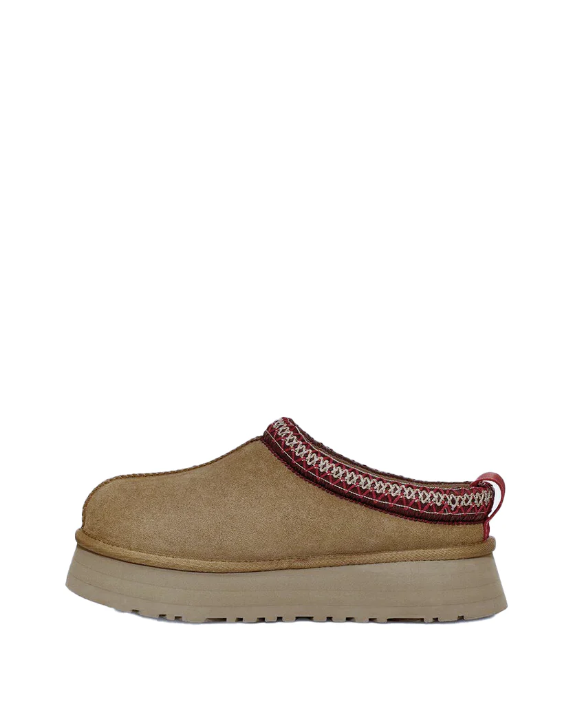 Tazz Slipper від Ugg - це жіночі черевики, виготовлені з м'якої замші каштаново-коричневого кольору з вишитою тасьмою навколо коміра в поєднанні бордового, червоного і коричневого кольорів та зручною застібкою ззаду. Класична підкладка з натуральної шкіри Ugg з устілкою з вовни UggPure для комфортної посадки. Оздоблені оновленою підошвою SugarSole на платформі висотою 40 мм.
